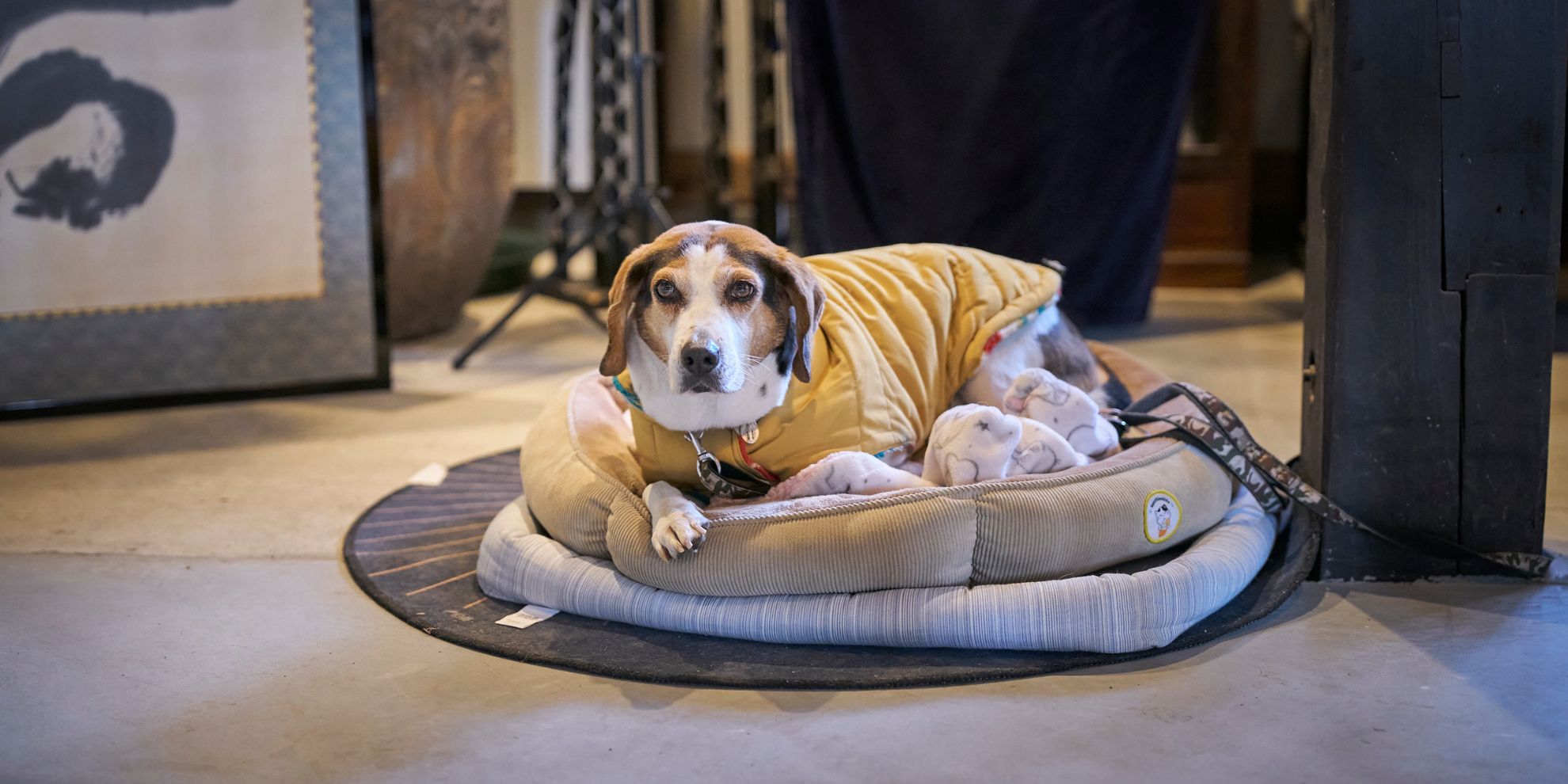そんなタイミングで迎えたのが、保護犬の梵旦(ボンタン)である。熊本・阿蘇で保護された元野犬のビーグルミックス。自然の中ではしゃぐ姿を見るたび、ふたりの気持ちは少しずつ変わっていった。「マンションのバルコニーでは、やっぱり狭いなと思って」と祥子さん。もともと秩父の三峯神社へ通うのが好きだったという。三峯神社も、青梅の武蔵御嶽神社も、ニホンオオカミを神格化した“大口真神(おおくちまがみ)”を祀る、“おいぬ様”の神社として知られている。