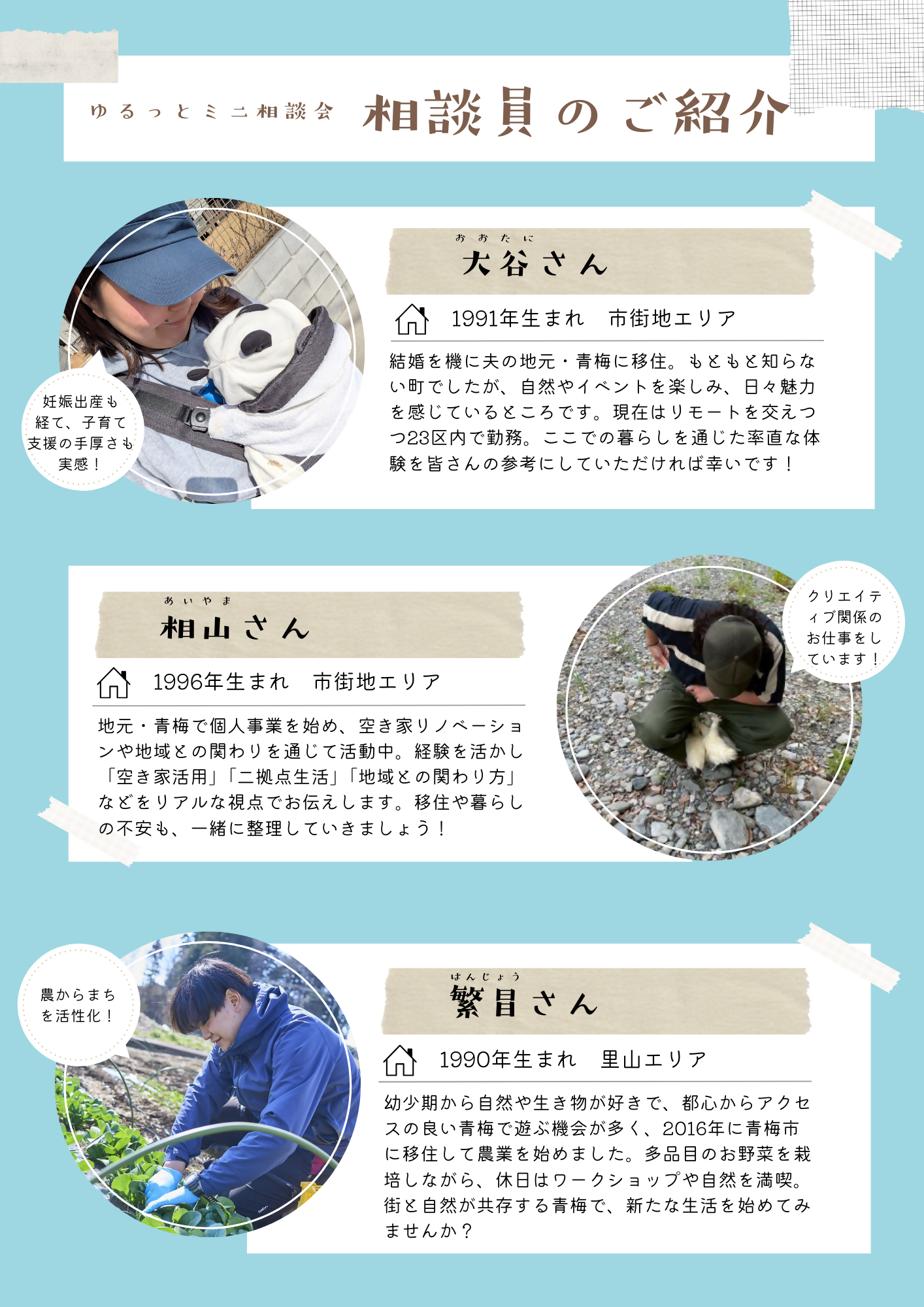 実際に青梅で暮らしている3名の相談員が、それぞれの視点で青梅でのリアルな暮らしをお伝えします。